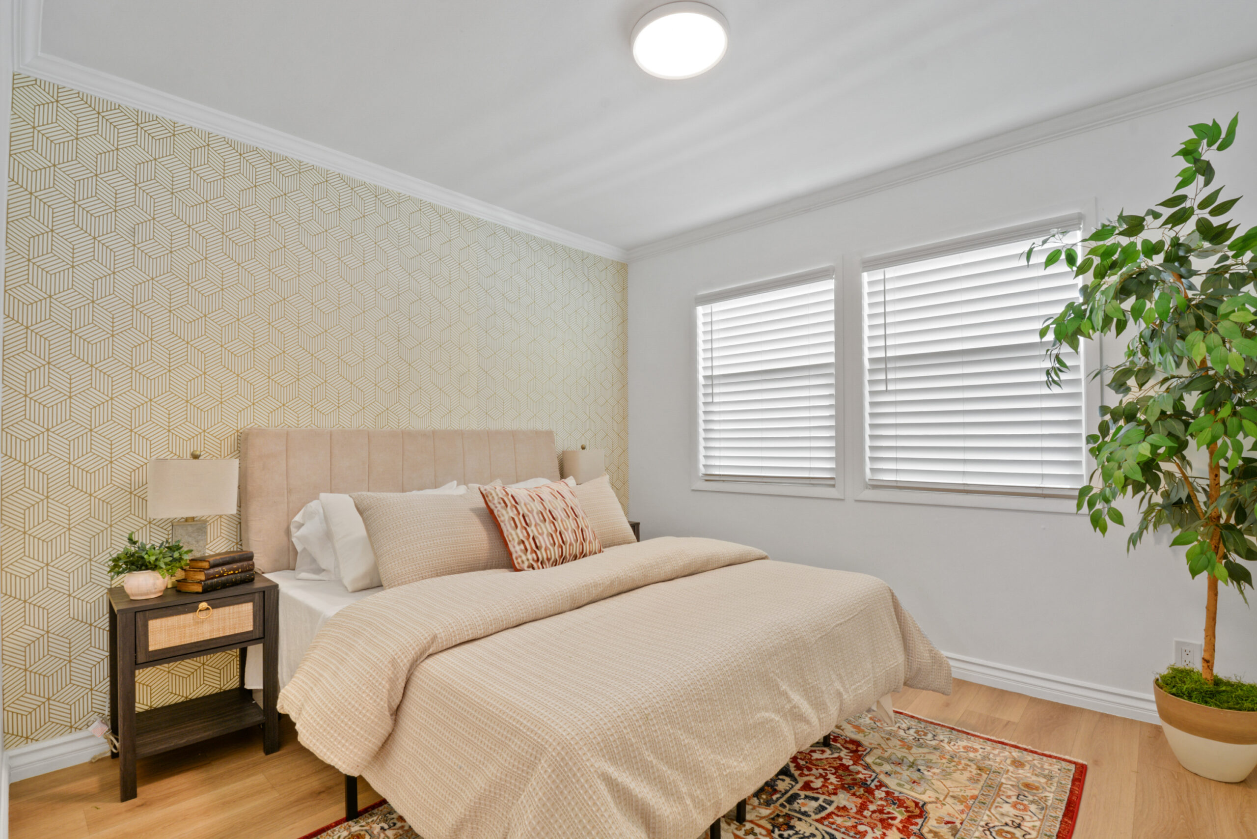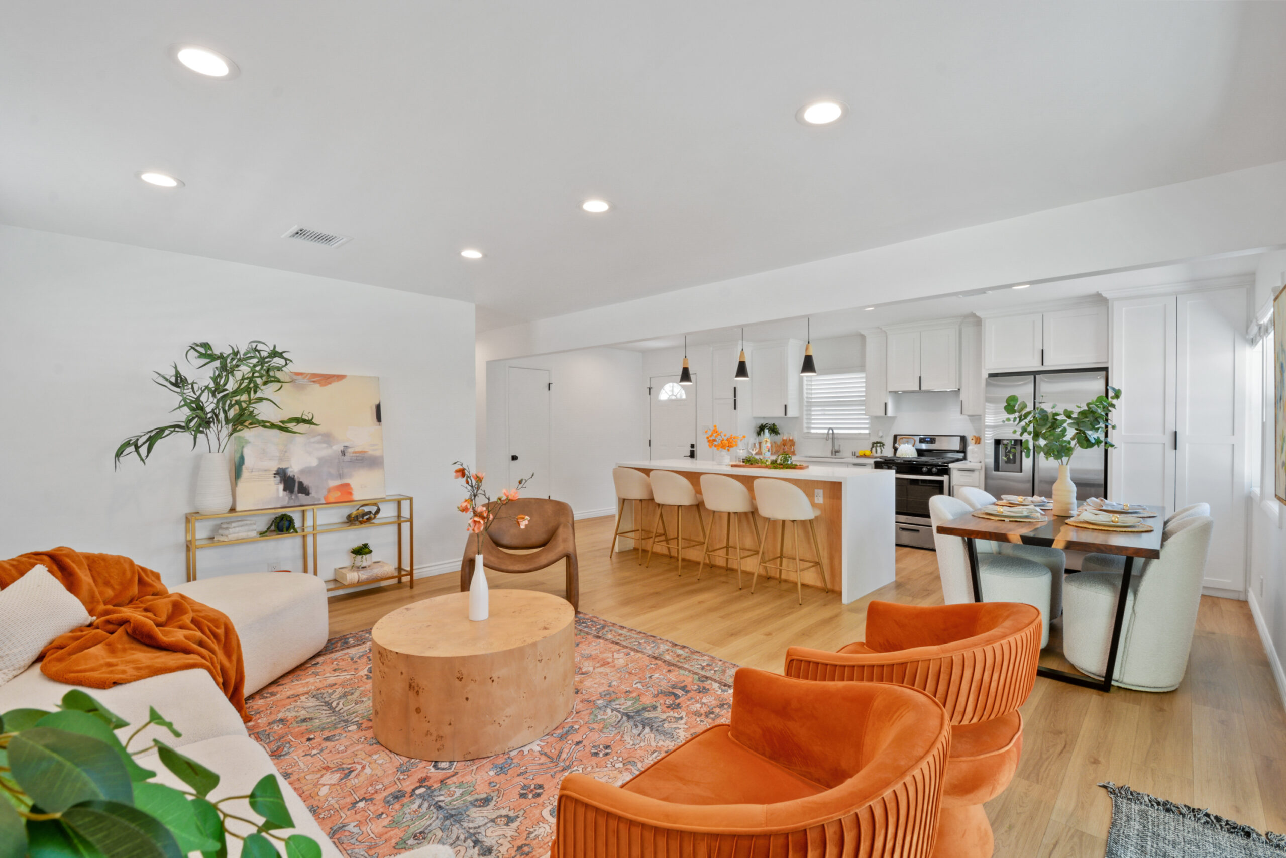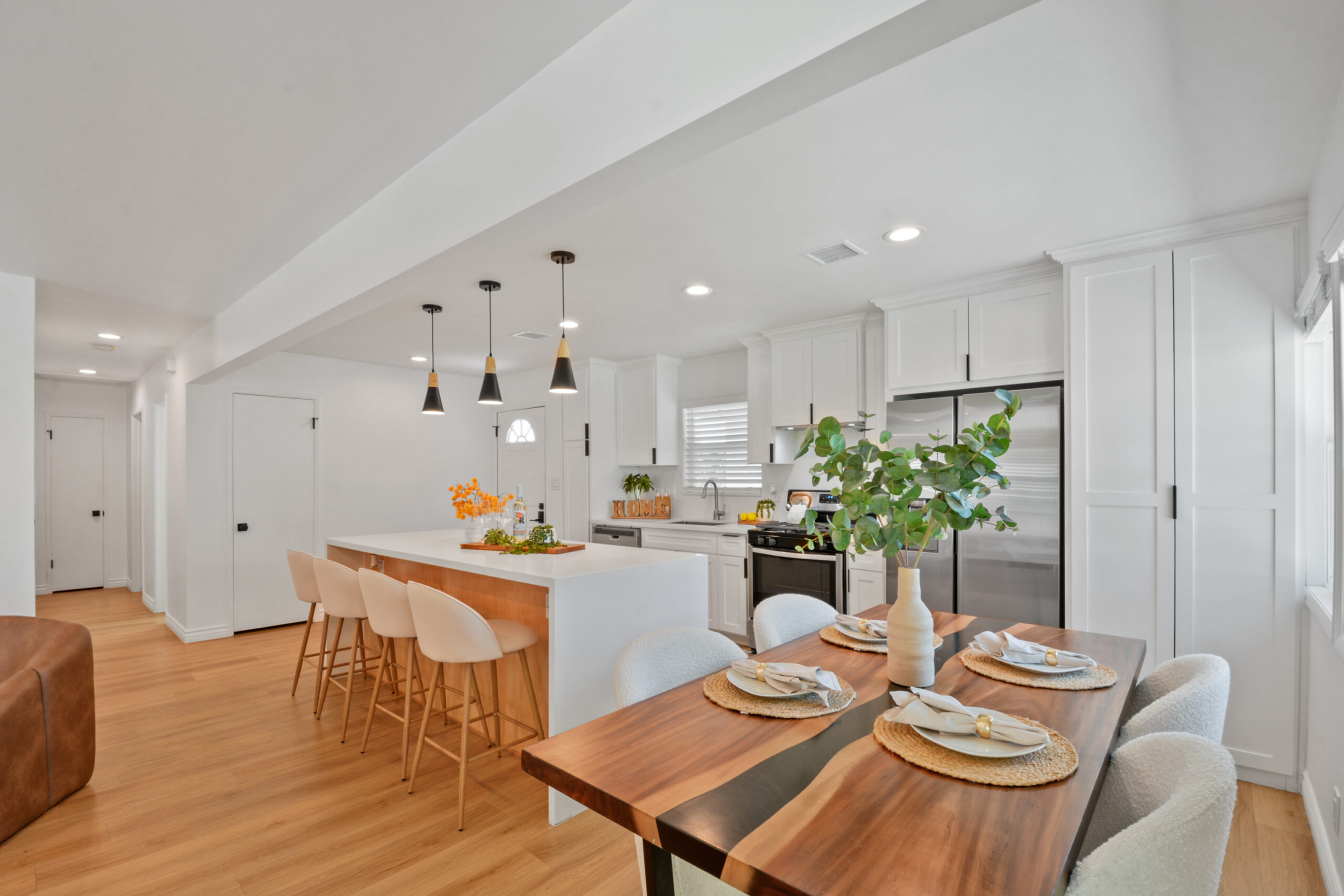 Welcome to 2463 Valhalla Street, a fully renovated 3-bedroom, 1-bath home offering 1,028 sq. ft. of stylish living space on a spacious lot. The open-concept layout is filled with natural light and features waterproof vinyl flooring, recessed lighting, and a seamless flow between the living room, dining area, and kitchen. The modern kitchen boasts quartz countertops, a waterfall island with ample space for seating and casual dining, sleek cabinetry including deep pots-and-pans drawers, and stainless steel appliances. The sliding doors open to a private backyard oasis with a patio, mature trees, and plenty of room to entertain or even add a pool. Each bedroom is uniquely designed with statement wallpaper and abundant light, complemented by a bathroom with a double vanity and clean modern finishes. Additional highlights include a two-car garage, driveway parking, a dedicated indoor closet with stacked washer/dryer, and a versatile bonus room- perfect as a home office or home gym. Conveniently located near Claremont Village, the Claremont Colleges, Montclair Plaza, and Bonelli Park with quick access to the 10, 71, and 60 freeways, this turnkey property blends modern design, comfort, and an unbeatable location.