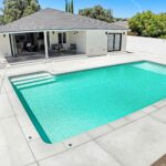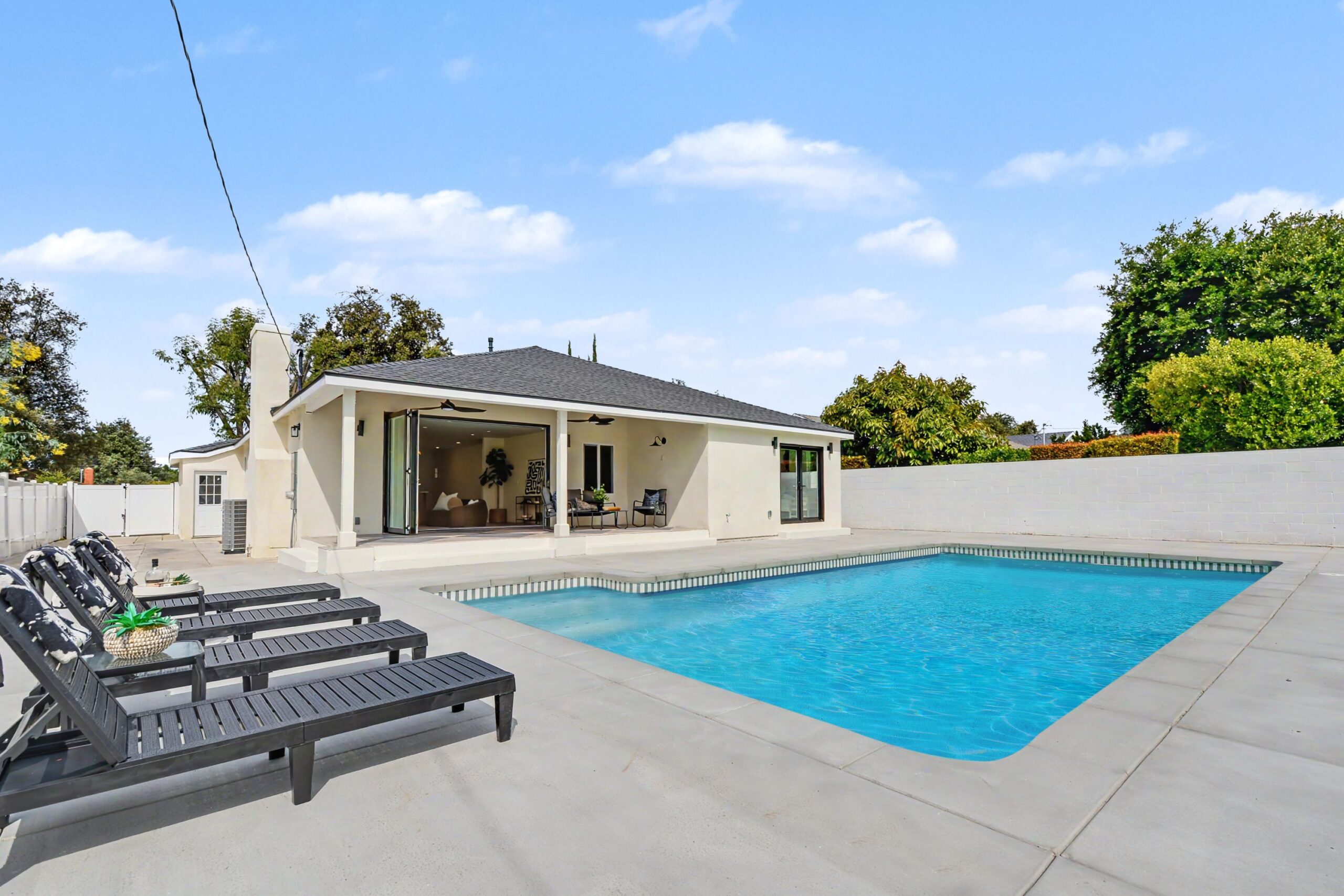 Beyond, the terrace overlooks an expansive pool framed by a lush lawn and vibrant landscaping, offering a serene and private backyard retreat. The primary suite is tucked into a tranquil corner of the home, complete with a walk-in closet, spa-inspired ensuite bath with brass fixtures, a freestanding soaking tub, and French doors that provide direct access to the pool.