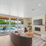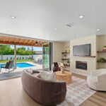Beyond the generous driveway and welcoming entry, the residence unfolds into a thoughtfully designed interior that balances style and comfort. The foyer opens to a bright, airy kitchen and dining area—an epicurean’s dream—featuring high-end yet durable finishes ideal for both entertaining and everyday living. A cozy sitting room connects this space to the outdoors, where floor-to-ceiling glass doors open fully to create a seamless transition to a shaded terrace, perfect for year-round lounging and entertaining.