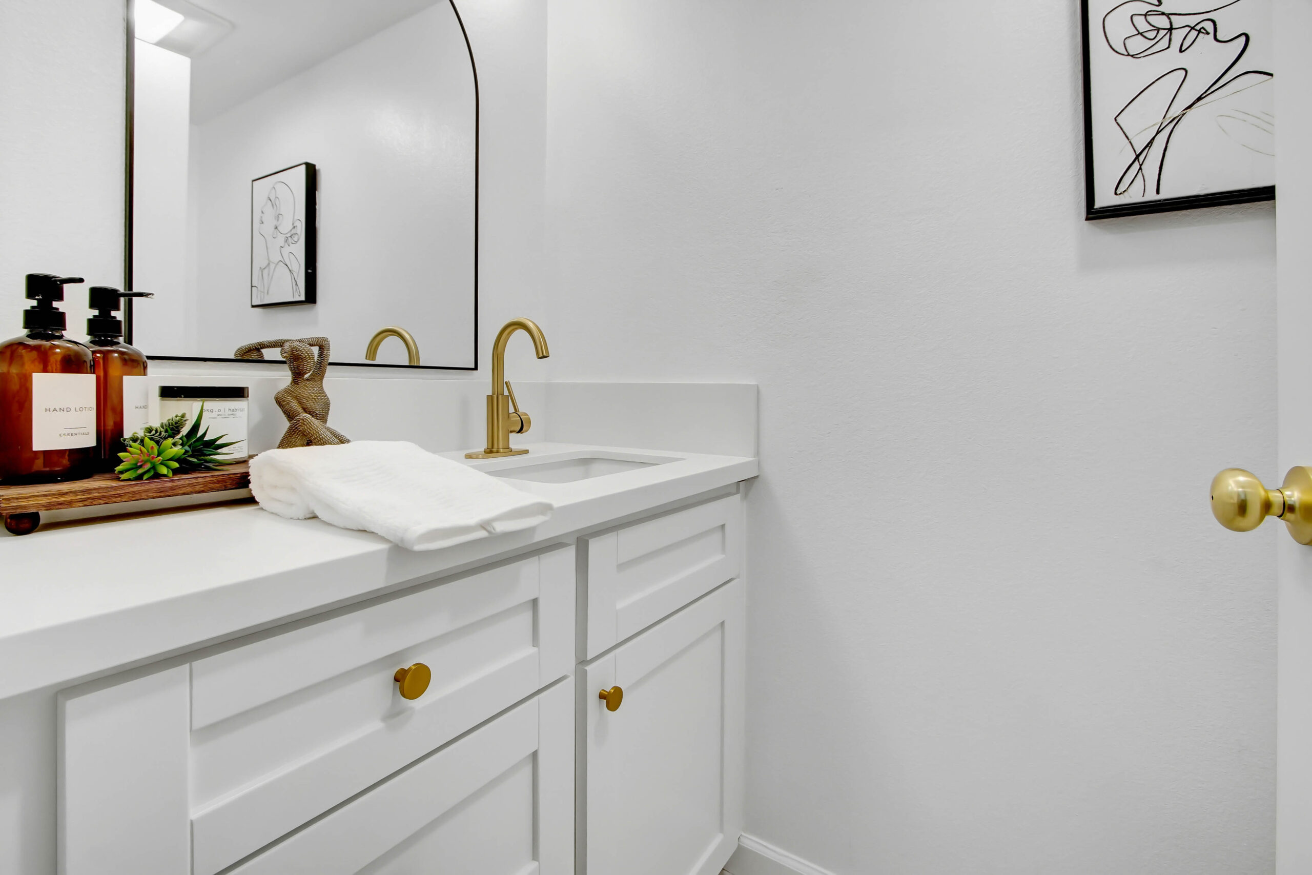 Upstairs, you’ll find two light-filled bedrooms with spacious closets, one of them a sizable walk-in. The updated full bathroom showcases tile flooring, a luxurious shower, a quartz-topped vanity sink and refined, clean finishes.